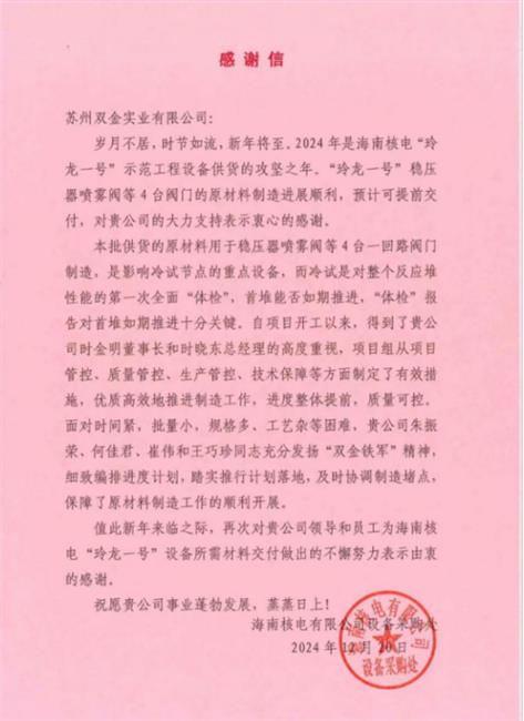 蘇州雙金收到海南核電有限公司高度贊揚交付“玲龍一號”穩(wěn)壓器噴霧閥等4臺閥門原材料完美供貨的感謝信