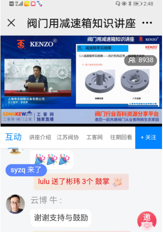 3月16日下午,江蘇省閥協(xié)與工客網(wǎng)聯(lián)合舉辦閥門知識技術(shù)知識網(wǎng)上直播,走進上海奇忠控制設備有限公司,由該公司技術(shù)總監(jiān)、工學碩士李杏萍直播講座,主講題目為《閥門用減速箱的基礎(chǔ)知識介紹》,主要探討閥門制造過程中配套使用電動執(zhí)行機構(gòu)減速箱技術(shù)應用等方面經(jīng)驗,當天直播受到了閥門行業(yè)內(nèi)外工程技術(shù)人士和閥門行業(yè)從業(yè)人員組織收聽收看,收看人數(shù)近萬人次,學到了從閥門電動執(zhí)行機構(gòu)主要配套減速箱技術(shù)應用方面全面知識和技術(shù)要點,有助于提高閥門行業(yè)對電動執(zhí)行機構(gòu)配套減速箱實際水平。