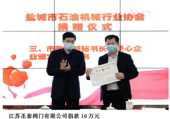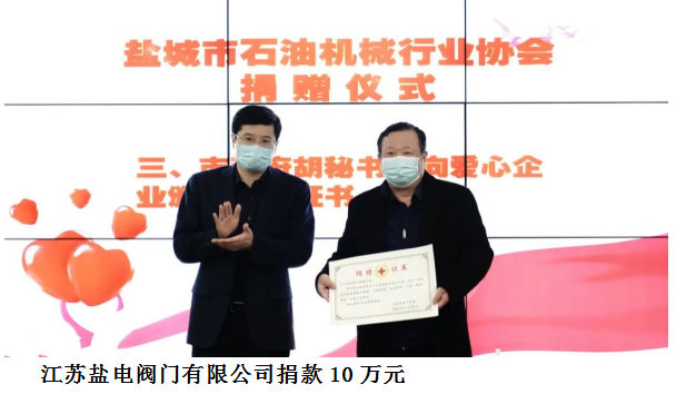 與蘇鹽閥門、圣泰閥門,鹽電閥門、萬恒鑄業(yè)等鹽城市10家石油企業(yè)各捐贈10萬元,10家企業(yè)共捐款100萬元,生動詮釋了企業(yè)家的家國情懷和責任擔當。在捐贈儀式現(xiàn)場,愛心企業(yè)負責人向市紅十字會遞交捐贈牌,鹽城市政府副秘書長胡柏林向愛心企業(yè)家頒發(fā)捐贈證書。