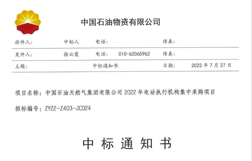 7月28日,中國石油天然氣集團(tuán)正式下發(fā)中標(biāo)通知書,江蘇閥協(xié)中4家電裝企業(yè)中標(biāo)中國石油2022年電動(dòng)執(zhí)行機(jī)構(gòu)集中采購項(xiàng)目。