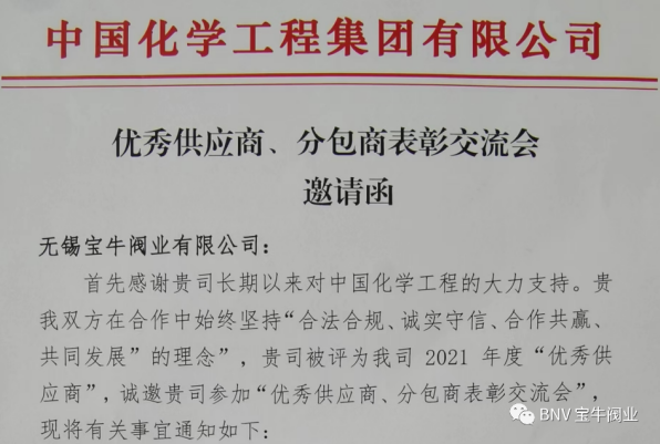 最近,無錫寶牛閥業(yè)有限公司再獲“中國化學工程集團有限公司優(yōu)秀供應商、分包商”殊榮