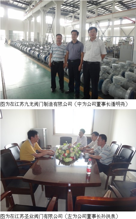 8月22日,江蘇閥協(xié)一行走訪了江蘇圣業(yè)閥門有限公司(鹽城市高中壓閥門有限公司),公司董事長孫洪泉接待,并參觀了該公司生產(chǎn)現(xiàn)場,該公司主要生產(chǎn)各類高中壓閥門,產(chǎn)品全部出口,年產(chǎn)值2億元左右;下午走訪了鹽城市圣泰閥門有限公司,受到公司常務(wù)副總史中樓的接待,并參觀該公司,年產(chǎn)值約2億元左右,閥門產(chǎn)品全部外銷;