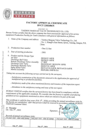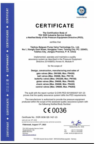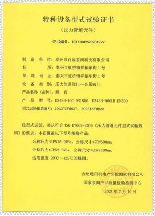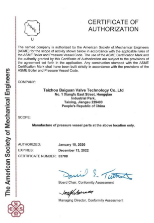 百冠科技已獲得國(guó)家市場(chǎng)監(jiān)督管理總局特種設(shè)備壓力管道金屬閥門(A1 級(jí))制造許可證(TS 認(rèn)證)和TS 型式試驗(yàn)證書(產(chǎn)品覆蓋閘、截、止、球、蝶和調(diào)節(jié)閥),歐盟壓力設(shè)備安全注冊(cè)許可(CE PED-H 模式);ISO9001/14001/45001 三合一管理體系、售后服務(wù)體系和測(cè)量體系等管理體系認(rèn)證;獲得 API6D 認(rèn)證、CCS1 船級(jí)社工廠認(rèn)可、BV工廠批準(zhǔn)等產(chǎn)品認(rèn)證;ISO15848 低泄漏試驗(yàn)、API607和 6FA 耐火試驗(yàn)、SIL3 級(jí)(閘閥、球閥和控制閥)安全功能性、ASME“U”鋼印等證書。