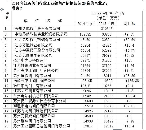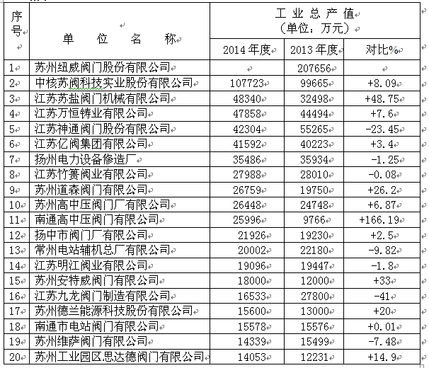 2014年閥門行業(yè)閥門生產(chǎn)企業(yè)工業(yè)總產(chǎn)值排名前20位的企業(yè)是:附表1