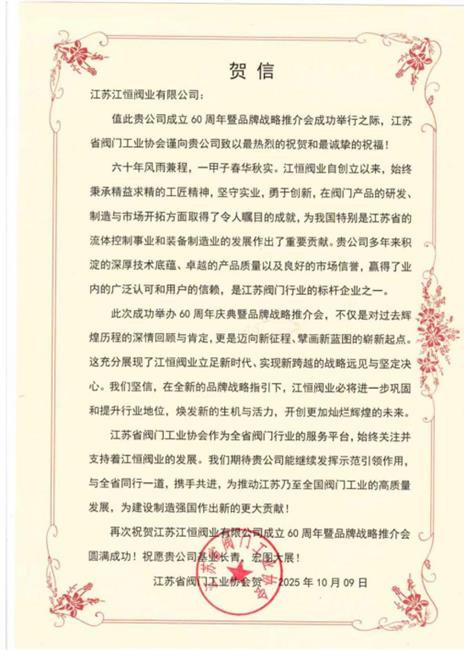 【閥協(xié)賀信】:江蘇閥協(xié)向江蘇江恒閥業(yè)有限公司成立60周年暨品牌戰(zhàn)略推介會成功舉行發(fā)賀信