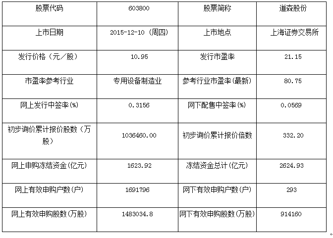 蘇州道森鉆采設(shè)備股份有限公司A股股本為20800萬(wàn)股,證券簡(jiǎn)稱(chēng)為"道森股份",證券代碼為"603800",本次公開(kāi)發(fā)行股票5,200 萬(wàn)股,道森股份(603800)將于2015年12 月10日在上海證券交易所上市。