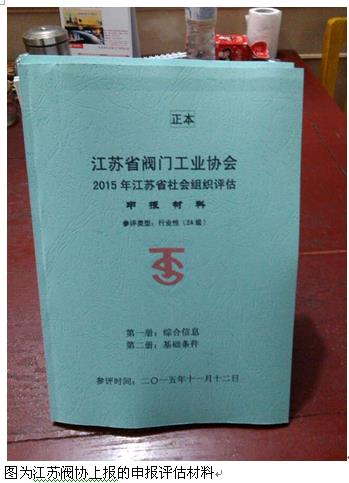 由于協(xié)會第一次搞,當(dāng)時有的無從著手,后理清了思路,重點提供原始材料,協(xié)會在11月15日上報了材料,經(jīng)過省學(xué)會中心評估,與協(xié)會上報的2A級還差200多分,他們來征求意見,協(xié)會再按不達(dá)標(biāo)的細(xì)則進(jìn)行補充佐證材料,第二次上報后,第三次還差40分,協(xié)會再次補充佐證材料,經(jīng)過幾輪提供材料,終于2015年底前材料上報結(jié)束,在今年14日評估結(jié)果正式公示,江蘇省閥門工業(yè)協(xié)會正式評上2A等級示范組織,這是省民政廳對我們一次綜合評估,使我們協(xié)會躋身了省級示范組織,意味著今后協(xié)會可以承擔(dān)政府轉(zhuǎn)換職能,搞好協(xié)會管理工作,為行業(yè)和會員做好服務(wù)。