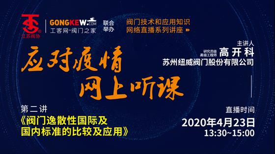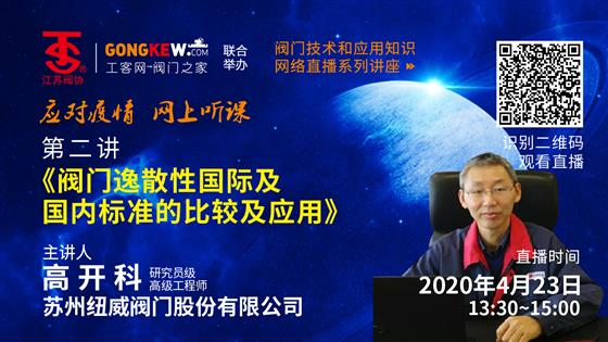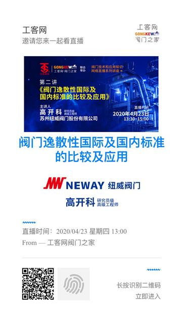 江蘇省閥門工業(yè)協(xié)會與“工客網(wǎng)-閥門之家”聯(lián)合定于2020年4月23日下午:13:30--15:00舉行《閥門技術(shù)和應(yīng)用知識網(wǎng)絡(luò)直播系列講座》第二講,將走進(jìn)蘇州紐威閥門股份有限公司現(xiàn)場直播,邀請?zhí)K州紐威閥門股份有限公司總工程師高開科主講《閥門逸散性國際及國內(nèi)標(biāo)準(zhǔn)的比較及應(yīng)用》的閥門低泄漏專業(yè)標(biāo)準(zhǔn)和應(yīng)用知識。