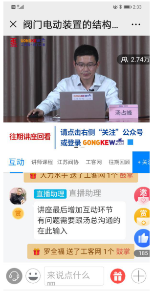 5月20日下午,江蘇省閥門工業(yè)協(xié)會(huì)與“工客網(wǎng)-閥門之家”聯(lián)合走進(jìn)揚(yáng)州電力設(shè)備修造廠有限公司現(xiàn)場(chǎng)直播,由揚(yáng)修廠公司機(jī)械技術(shù)部主任、高級(jí)工程師湯占峰主講《閥門電動(dòng)裝置的結(jié)構(gòu)原理及標(biāo)準(zhǔn)簡介》的閥門電裝相關(guān)內(nèi)容,直播再獲成功。