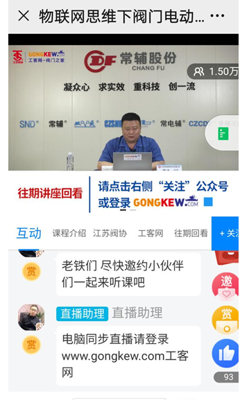 江蘇省閥門工業(yè)協(xié)會與“工客網(wǎng)-閥門之家”聯(lián)合定于6月29日下午13:30--15:00走進(jìn)常州電站輔機(jī)股份有限公司,進(jìn)行了第五講現(xiàn)場直播,由該公司技術(shù)部經(jīng)理、高級工程師邵杰主講《物聯(lián)網(wǎng)思維下閥門電動裝置的應(yīng)用》主要介紹物聯(lián)網(wǎng)下閥門電裝應(yīng)用相關(guān)內(nèi)容,閥門行業(yè)內(nèi)外人士進(jìn)入組織了收聽收看!收看人數(shù)達(dá)2萬多,再次獲得了成功!