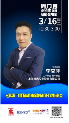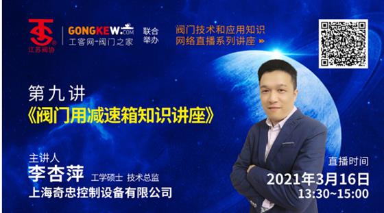 江蘇省閥協(xié)與工客網聯合舉辦閥門知識技術知識網上直播講座新年又要開講了,3月16日下午,上海奇忠控制設備有限公司技術總監(jiān)、工學碩士李杏萍,主講題目為《閥門用減速箱的基礎知識介紹》,主要探討閥門制造過程中配套使用電動執(zhí)行機構減速箱技術應用等方面經驗,歡迎閥門行業(yè)內外工程技術人士和閥門行業(yè)從業(yè)人員組織收聽收看。