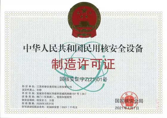 江蘇科維儀表控制工程有限公司取得國家核級兩張證書