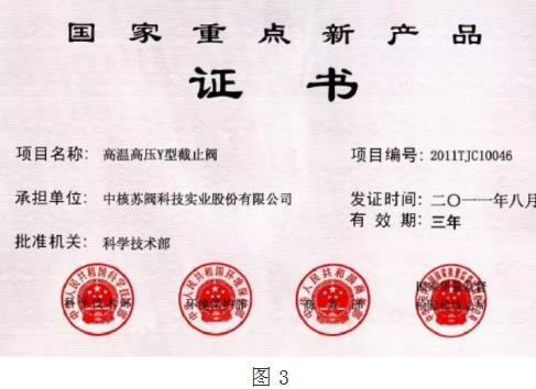 自主研發(fā)的高溫高壓Y型截止閥已經(jīng)取得國家發(fā)明專利,填補了我國乙烯裝置關(guān)鍵閥門的空白,國產(chǎn)化意義重大。為此國家四部委給我們頒發(fā)了國家重點新產(chǎn)品證書,見圖3。