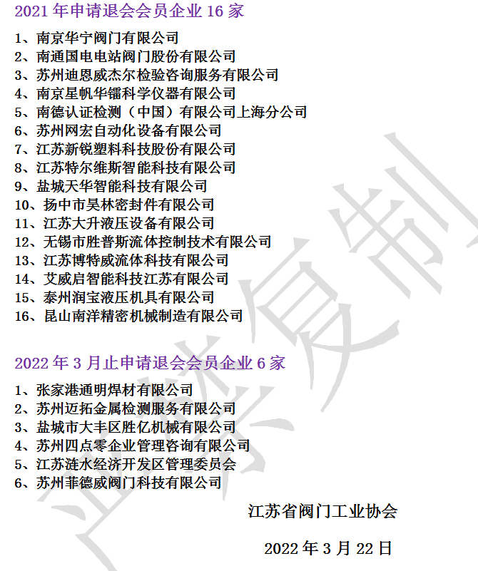 江蘇閥協(xié)2021年度-2022年度新加入和退會企業(yè)名單