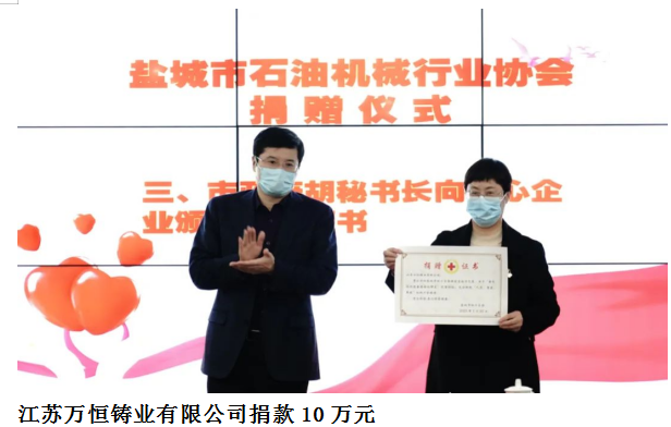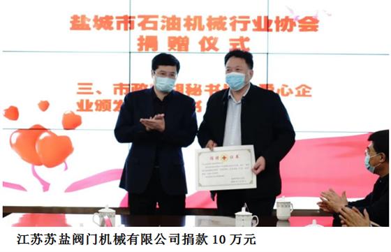 與蘇鹽閥門、圣泰閥門,鹽電閥門、萬恒鑄業(yè)等鹽城市10家石油企業(yè)各捐贈10萬元,10家企業(yè)共捐款100萬元,生動詮釋了企業(yè)家的家國情懷和責任擔當。在捐贈儀式現(xiàn)場,愛心企業(yè)負責人向市紅十字會遞交捐贈牌,鹽城市政府副秘書長胡柏林向愛心企業(yè)家頒發(fā)捐贈證書。
