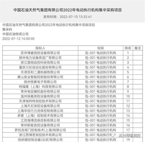 其中,蘇州博睿測控設(shè)備有限公司以綜合分排名第一名中標(biāo)中石油2022年《包-001電動(dòng)執(zhí)行機(jī)構(gòu)集中采購項(xiàng)目》。
