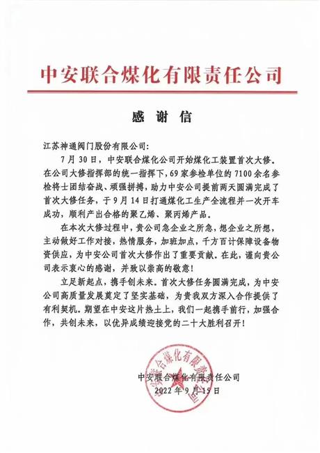 近日,江蘇神通收到中安聯(lián)合煤化有限責(zé)任公司發(fā)來(lái)的感謝信,對(duì)前期參與中安聯(lián)合煤化工裝置首次大修任務(wù)中主動(dòng)做好工作對(duì)接、熱情服務(wù)、加班加點(diǎn),千方百計(jì)保障設(shè)備物資供應(yīng),圓滿完成首次檢修任務(wù)表示感謝。