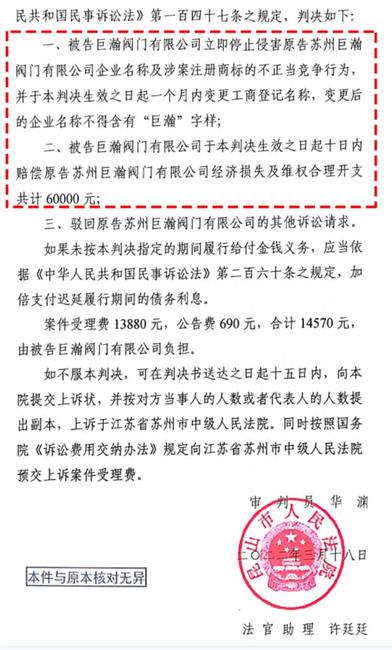 【閥門商標(biāo)維權(quán)】蘇州巨瀚閥門有限公司訴告“巨瀚閥門”不正當(dāng)競爭及商標(biāo)維權(quán)案經(jīng)昆明法院判決勝訴