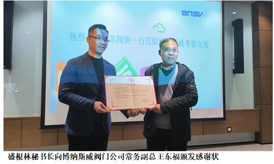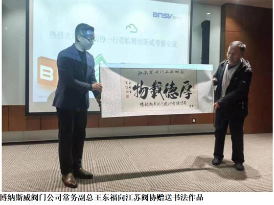 3月16日下午,江蘇閥協(xié)赴津冀學(xué)習(xí)考察團(tuán)參觀位于天津市寶坻九園工業(yè)園區(qū)的博納斯威閥門股份有限公司,先參加了在天津市中心的博納斯威閥門研發(fā)中心舉行座談會(huì),座談會(huì)上播放了公司宣傳片及公司介紹。公司常務(wù)副總王東福致歡迎詞,交流了博納斯威閥門《輸水系統(tǒng)數(shù)字孿生與智慧運(yùn)營解決方案》,博納斯威閥門股份有限公司努力爭創(chuàng)“中國水閥第一品牌”;盛根林秘書長也致辭,雙方進(jìn)行了座談交流,企業(yè)家代表做了交流。后驅(qū)車到天津?qū)氎鎱^(qū)博納斯威閥門工廠現(xiàn)場參觀,董事長王東輝陪同參觀,博納斯威他們的精益管理、現(xiàn)場管理是許多同行學(xué)習(xí)和借鑒,參觀后還一起合影留念。
