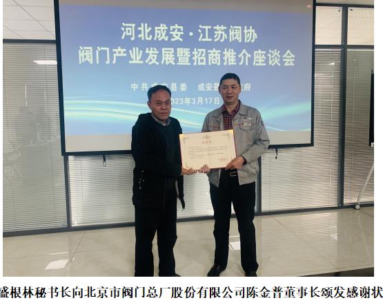 接著,舉行了河北成安·江蘇閥協(xié)召開閥門產(chǎn)業(yè)發(fā)展暨招商推介座談會(huì)。河北成安縣政府縣長劉丙勝,縣人大常委會(huì)主任劉正國,江蘇閥協(xié)及各位企業(yè)家參加會(huì)議。
