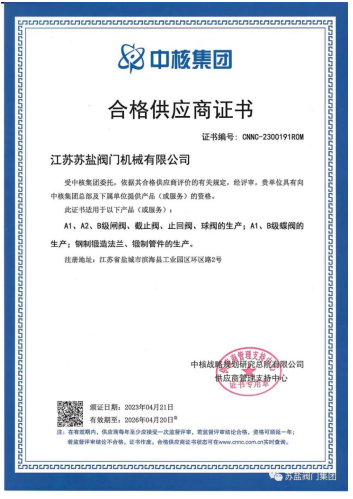江蘇蘇鹽閥門機(jī)械有限公司獲得中核集團(tuán)合格供應(yīng)商資質(zhì)