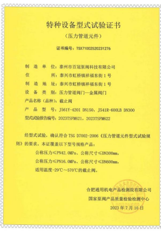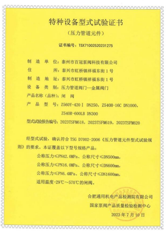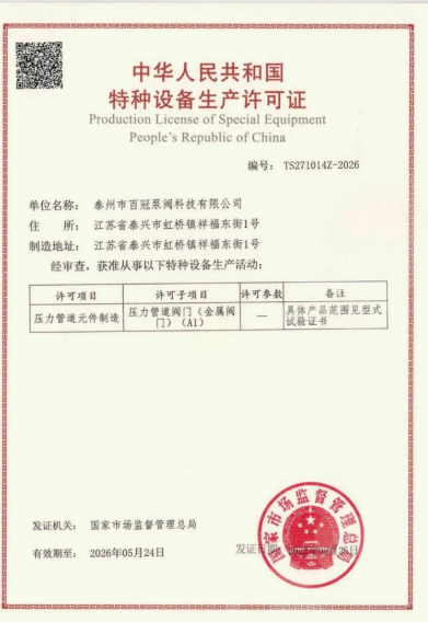 百冠科技已獲得國(guó)家市場(chǎng)監(jiān)督管理總局特種設(shè)備壓力管道金屬閥門(A1 級(jí))制造許可證(TS 認(rèn)證)和TS 型式試驗(yàn)證書(產(chǎn)品覆蓋閘、截、止、球、蝶和調(diào)節(jié)閥),歐盟壓力設(shè)備安全注冊(cè)許可(CE PED-H 模式);ISO9001/14001/45001 三合一管理體系、售后服務(wù)體系和測(cè)量體系等管理體系認(rèn)證;獲得 API6D 認(rèn)證、CCS1 船級(jí)社工廠認(rèn)可、BV工廠批準(zhǔn)等產(chǎn)品認(rèn)證;ISO15848 低泄漏試驗(yàn)、API607和 6FA 耐火試驗(yàn)、SIL3 級(jí)(閘閥、球閥和控制閥)安全功能性、ASME“U”鋼印等證書。