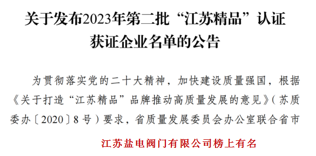 鹽電閥門(mén)上榜“江蘇精品”認(rèn)證