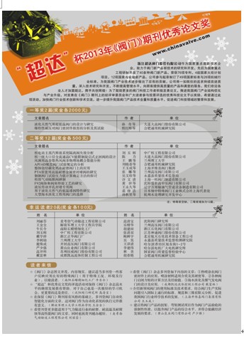為了鼓勵(lì)更多的閥門科技工作者積極發(fā)表論文,推進(jìn)我國(guó)閥門產(chǎn)業(yè)結(jié)構(gòu)優(yōu)化與產(chǎn)業(yè)升級(jí),2013年該公司與《閥門》雜志聯(lián)合舉辦2012年度“超達(dá)”杯《閥門》期刊優(yōu)秀論文評(píng)選獎(jiǎng)活動(dòng),對(duì)發(fā)表在《閥門》雜志國(guó)家級(jí)刊物上的并經(jīng)評(píng)審委員會(huì)和廣大讀者參與投投票評(píng)選出的優(yōu)秀科技論文予以獎(jiǎng)勵(lì),通過此活動(dòng),加快閥門行業(yè)技術(shù)創(chuàng)新和學(xué)術(shù)交流,進(jìn)一步提升我國(guó)閥門產(chǎn)品技術(shù)含量和質(zhì)量水平,促進(jìn)閥門科技領(lǐng)域的繁榮和發(fā)展,此活動(dòng)已成功舉辦了9屆,得到了業(yè)內(nèi)廣大閥門科技人員的積極支持,發(fā)表和評(píng)選出的的優(yōu)秀論文也代表了閥門行業(yè)較高水平,同時(shí)這些優(yōu)秀論文都具有創(chuàng)新性、實(shí)用性和導(dǎo)向性。