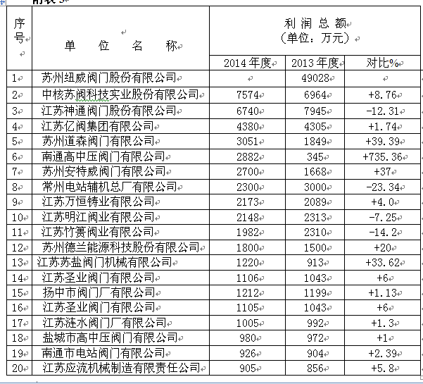 江蘇閥門行業(yè)2014年度產(chǎn)銷利排列前20名的企業(yè)