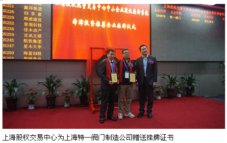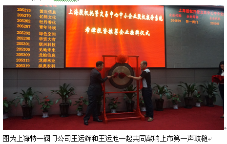 接著上海股權交易中心為上海特一閥門制造公司贈送上市紀念牌,作為企業(yè)發(fā)展進程中重要見證。接著,上海特一閥門制造有限公司創(chuàng)始人王運輝和董事長王運勝一起共同敲響上市第一聲鼓槌后,標志著特一閥門正式掛牌上海股權托管交易中心中小企業(yè)股權報價系統(tǒng)Q版,走上資本市場的新的征程。
